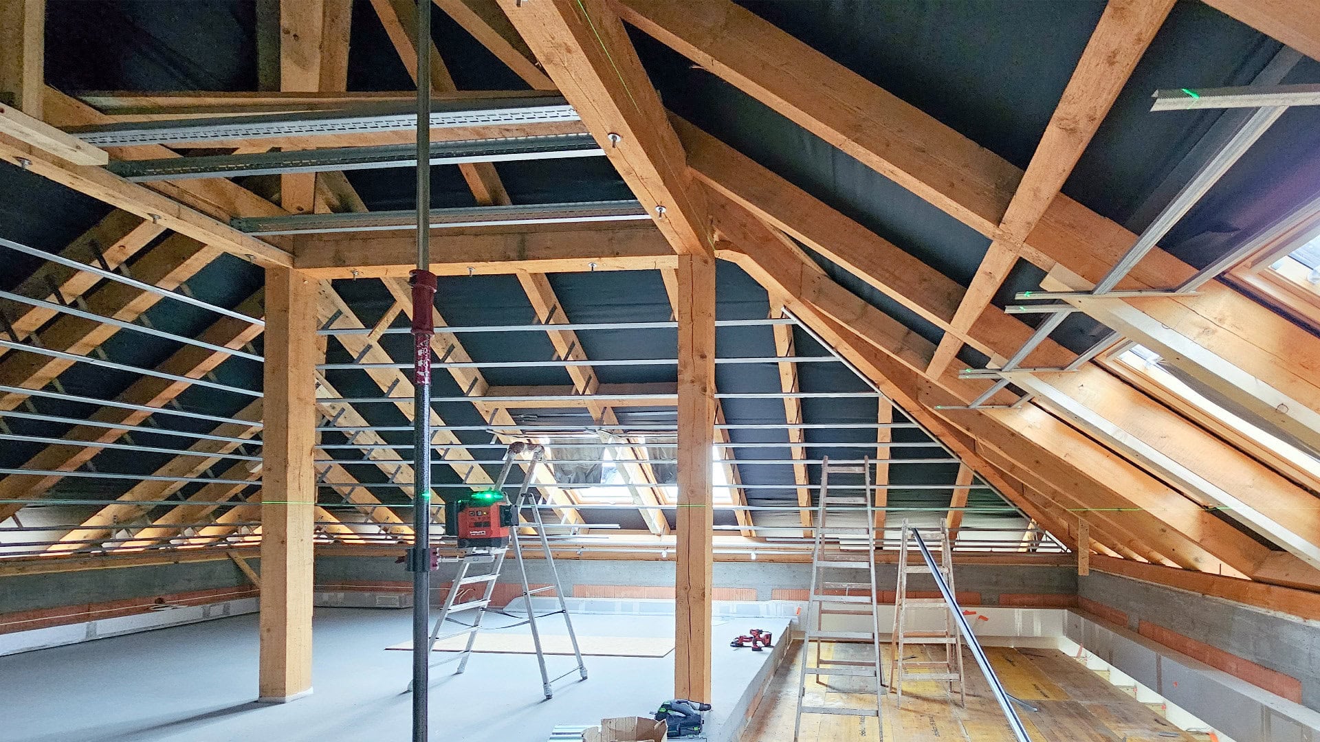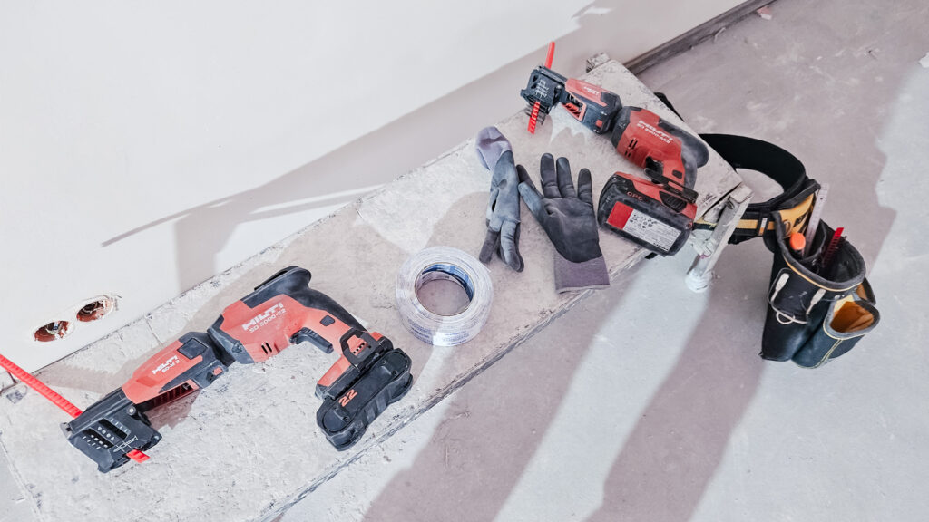 Do prac związanych z montażem suchej zabudowy wykorzystujemy wysokiej jakości sprzęt firmy Hilti. Nowoczesne narzędzia, takie jak zaawansowane lasery liniowe, pozwalają nam na bardzo precyzyjne wyznaczenie poziomów, pionów oraz kątów na dużych powierzchniach.